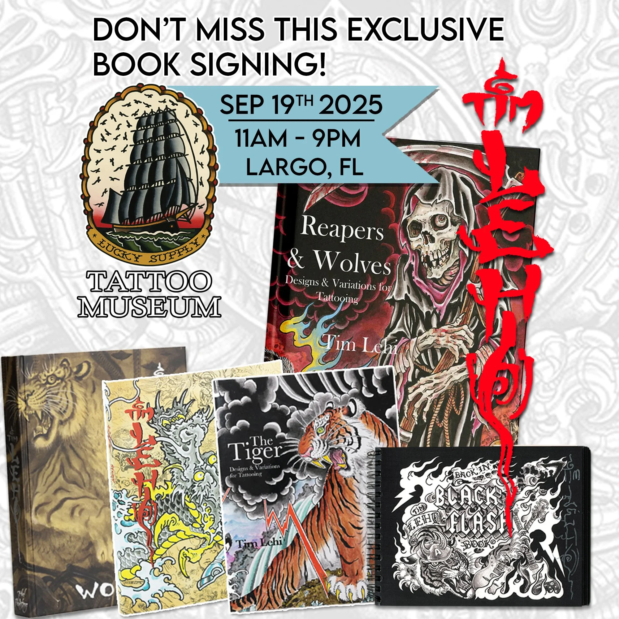 🚨 Mark it down: Friday, Sept. 19th – 11AM to 9PM. World-renowned tattoo artist Tim Lehi is taking over Lucky Supply and Lucky’s Tattoo Museum in Largo, Florida for a book signing + meet & greet.